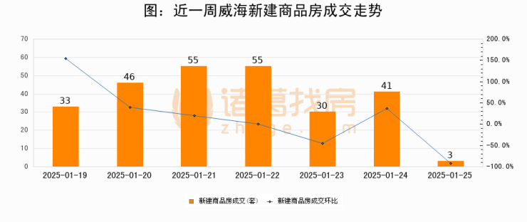 根据威海市住房和城乡建设局数据显示,2025年01月25日威海新建商品房成交3套,较昨日减少38套,环比下降92.7%