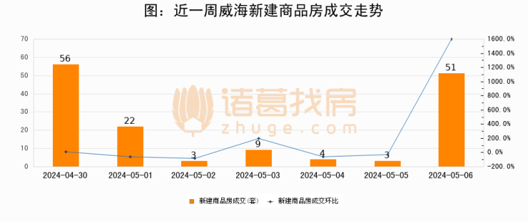 根据威海市住房和城乡建设局数据显示,2024年05月06日威海新建商品房成交51套,较昨日增加48套,环比上涨1600%