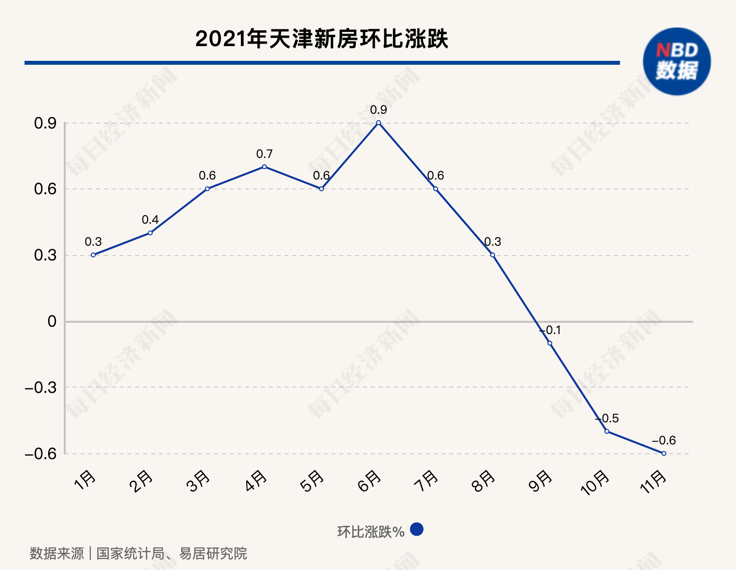 国家统计局数据显示,天津二手房价格2021年以来价格环比变动未超过0.6%,10月和11月分别下降0.1%和0.3%。