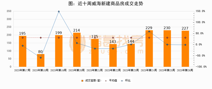 进入2025年第26周(06月23日-06月29日),威海新建商品房成交227套,较上周减少3套,环比下降1.3%