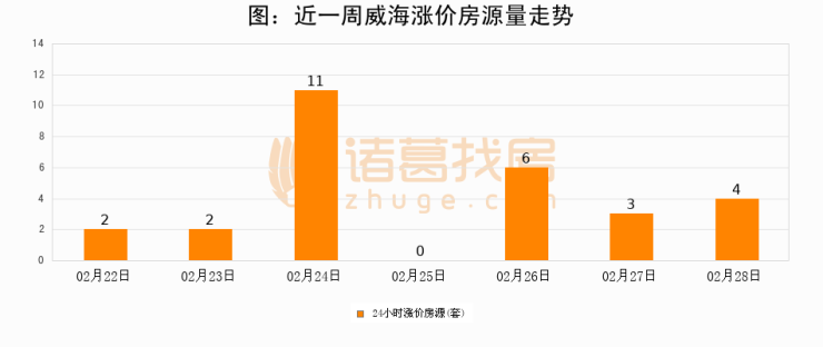 根据诸葛找房数据显示,威海24小时涨价房源量为4套,较02月27日增加1套,环比上涨33.3%。与此同时,涨价房源占比小幅扩大,业主信心有所提升。