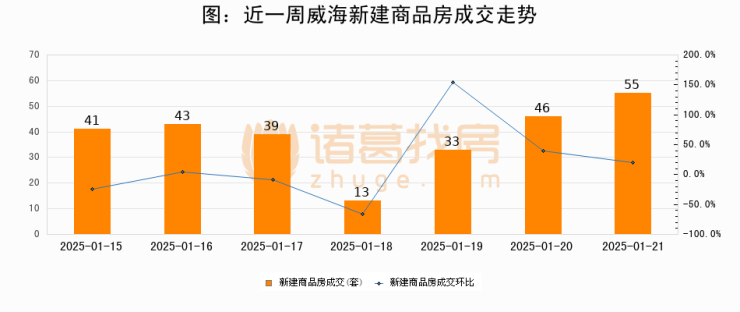 根据威海市住房和城乡建设局数据显示,2025年01月21日威海新建商品房成交55套,较昨日增加9套,环比上涨19.6%