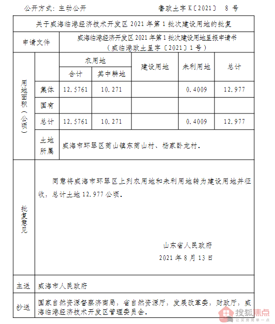 山东省人民政府同意将威海市环翠区苘山镇东苘山村、杨家卧龙村合计12.977公顷农用地和未利用地转为建设用地并征收。其中,农用地10.271公顷,未利用地0.4009公顷。