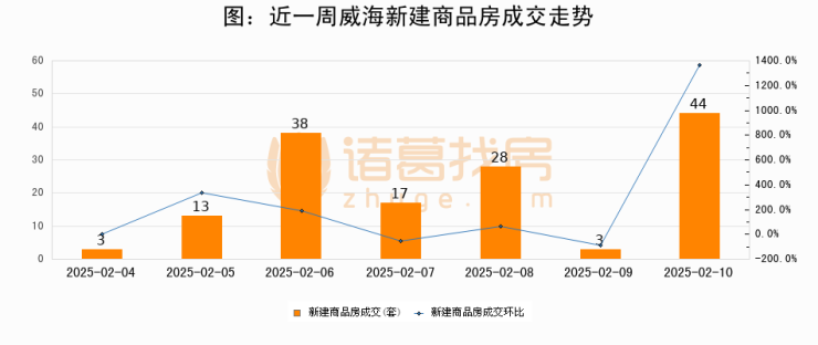 根据威海市住房和城乡建设局数据显示,2025年02月10日威海新建商品房成交44套,较昨日增加41套,环比上涨1366.7%