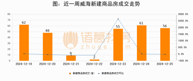 根据威海市住房和城乡建设局数据显示,2024年12月25日威海新建商品房成交56套,较昨日减少5套,环比下降8.2%