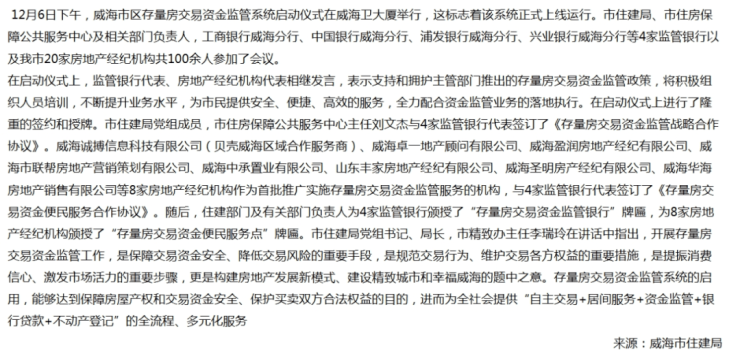 威海市区存量房交易资金监管系统正式上线