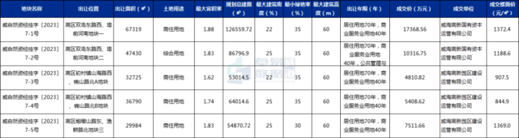 据卓易监测数据显示,威海市高区双岛湾区域成交5宗地块,其中4宗商住用地,1宗综合用地,总出让面积约21.4万平方米,总成交价约4.5亿元,详情如下
