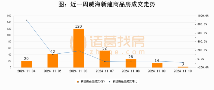 根据威海市住房和城乡建设局数据显示,2024年11月10日威海新建商品房成交3套,较昨日减少11套,环比下降78.6%