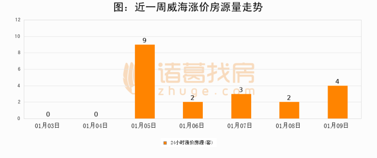 根据诸葛找房数据显示,威海24小时涨价房源量为4套,较01月08日增加2套,环比上涨100%。与此同时,涨价房源占比小幅扩大,业主信心有所提升。