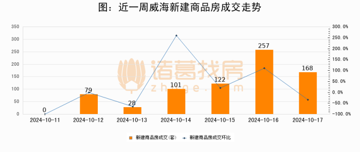 根据威海市住房和城乡建设局数据显示,2024年10月17日威海新建商品房成交168套,较昨日减少89套,环比下降34.6%