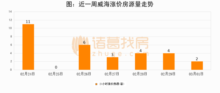 根据诸葛找房数据显示,威海24小时涨价房源量为2套,较02月29日减少2套,环比下降50%。与此同时,涨价房源占比小幅回落,对于购房者来说是一个入市窗口期,购房者可抓住时机入市。