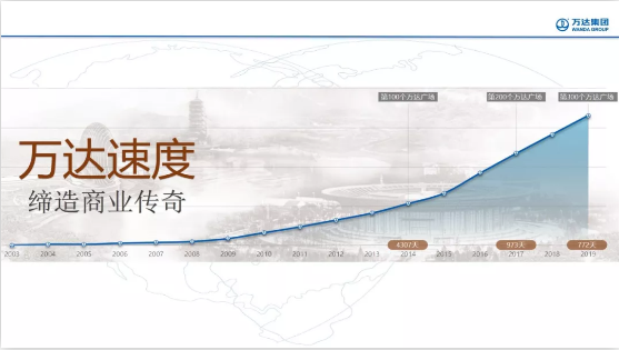 2003年1月,排名前列座万达广场。2014年10月,第100个万达广场开业,万达迎来了百店时代。2017年6月,第200个万达广场开业,万达正式迈入了200+时代。从1到100,万达走了12年;从100迈向200,万达用了973天,平均每10天就要开业一座新的万达广场;从200奔向300,预计将用772天。