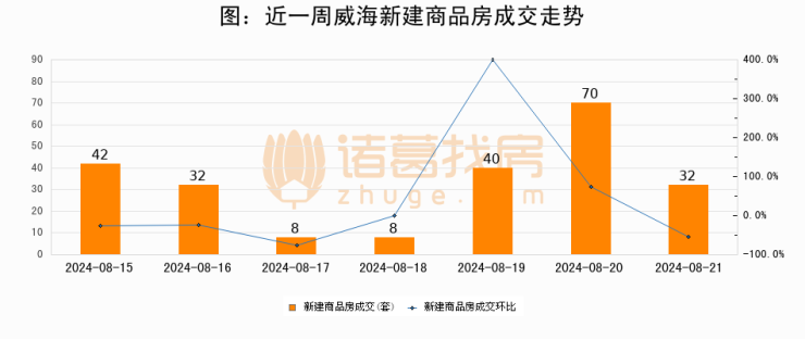 根据威海市住房和城乡建设局数据显示,2024年08月21日威海新建商品房成交32套,较昨日减少38套,环比下降54.3%。近一周威海新建商品房日均成交34套。08月21日单日成交32套,低于近一周平均水平5.9%。