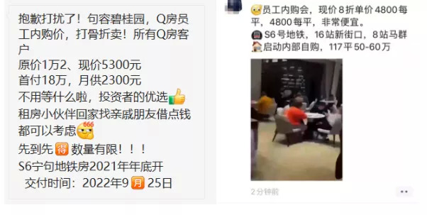 前段时间,句容某盘的打折抛房活动刷爆朋友圈,一口价5500元/㎡,要知道此项目原先的售价12000元/m2,相当于原先价格“对半砍”!117㎡的房子60万起!不仅如此,中介更是报出5300元/㎡、4800元/㎡各种版本,相当于分销再让利8.19万……