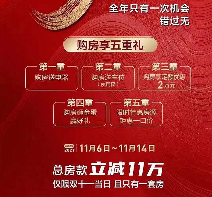 不仅如此,各大开发商也开始蹭“双十一”的热度,纷纷推出了双十一活动。买房送装修、买房送车位、总房款立减11万元!