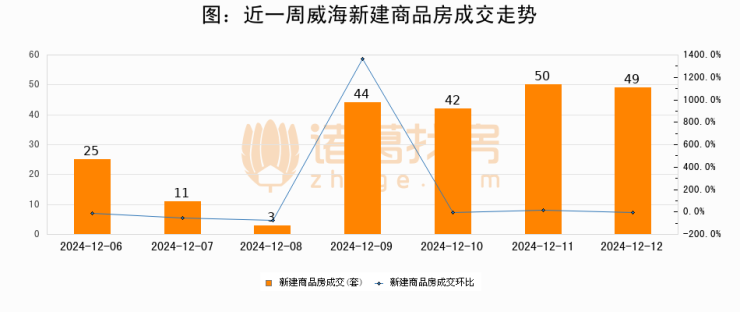 根据威海市住房和城乡建设局数据显示,2024年12月12日威海新建商品房成交49套,较昨日减少1套,环比下降2%