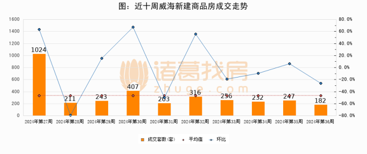 进入2024年第36周(09月02日-09月08日),威海新建商品房成交182套,较上周减少65套,环比下降26.3%