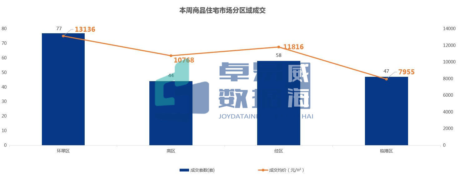 从区域来看,本周威海环翠区在成交面积、均价和套数方面高于其他三个区,成交77套,成交面积9360㎡,均价13136元/平。环翠区本周有海信观澜、海信君澜和华瀚大湖公馆等多个高端院墅项目成交均价两万左右,拉高环翠区整体成交均价。
