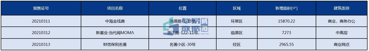 据卓易监测数据显示,本周威海市住房和城乡建设局只更新了3张预售证,涉及环翠区中海金线鼎、临港区新基业·当代阅ΜΟΜΛ、经区财信保利名著项目,新增供应面积2.6万平方米,新增住宅建面约7273平方米。