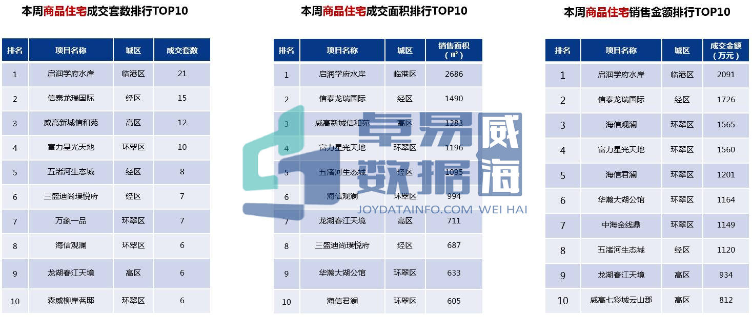 本周项目成交TOP10各区分散成交,临港区启润水岸学府项目和经区信泰龙瑞国际项目本周在成交套数、成交面积、销售总金额排行榜上均位于前两位。