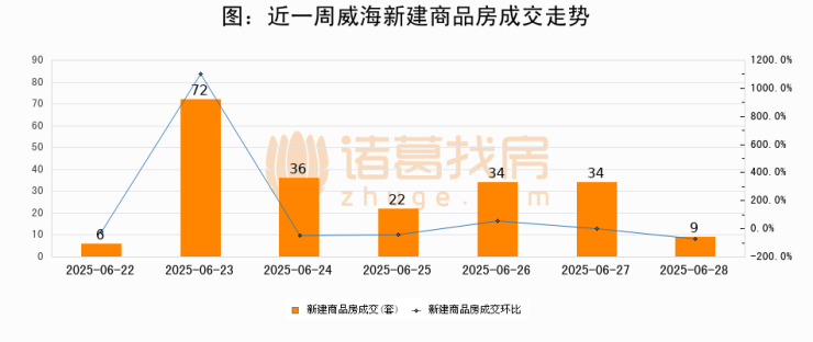 根据威海市住房和城乡建设局数据显示,2025年06月28日威海新建商品房成交9套,较昨日减少25套,环比下降73.5%。近一周威海新建商品房日均成交31套。06月28日单日成交9套,低于近一周平均水平71%。