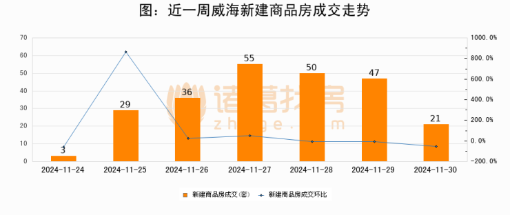 根据威海市住房和城乡建设局数据显示,2024年11月30日威海新建商品房成交21套,较昨日减少26套,环比下降55.3%。近一周威海新建商品房日均成交35套。11月30日单日成交21套,低于近一周平均水平40%。
