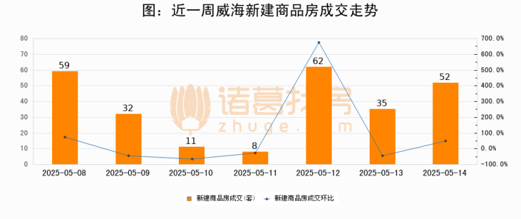 根据威海市住房和城乡建设局数据显示,2025年05月14日威海新建商品房成交52套,较昨日增加17套,环比上涨48.6%