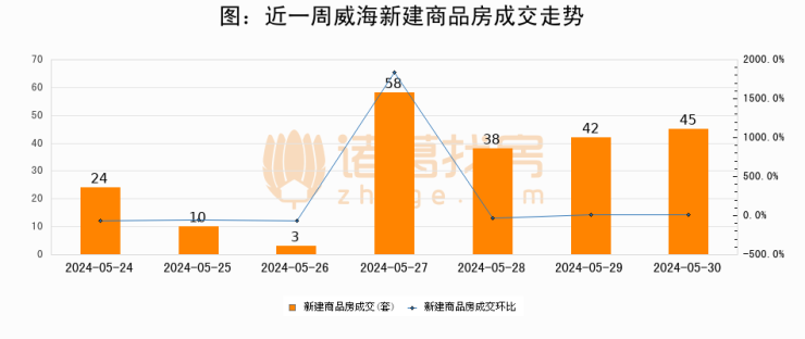 根据威海市住房和城乡建设局数据显示,2024年05月30日威海新建商品房成交45套,较昨日增加3套,环比上涨7.1%