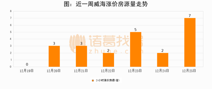 根据诸葛找房数据显示,威海24小时涨价房源量为7套,较12月24日增加5套,环比上涨250%。与此同时,涨价房源占比小幅扩大,业主信心有所提升。