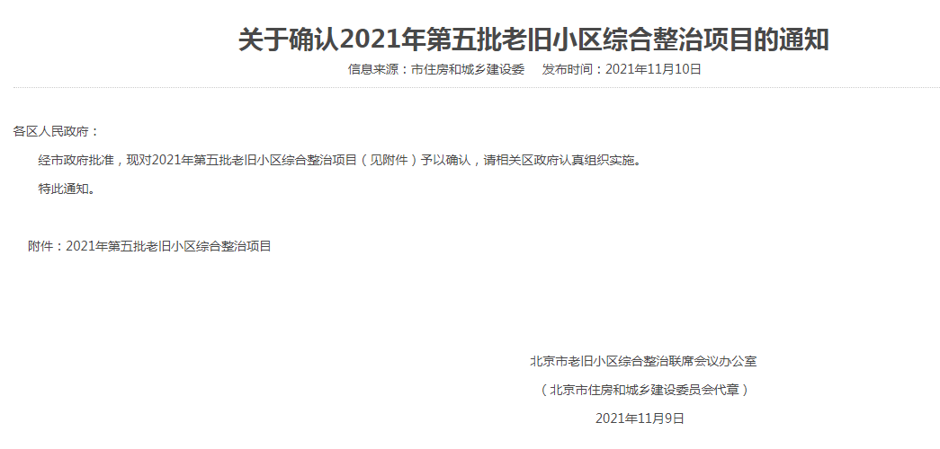 11月10日,北京市住房和城乡建设委员会公告称,对2021年第五批老旧小区综合整治项目予以确认。
