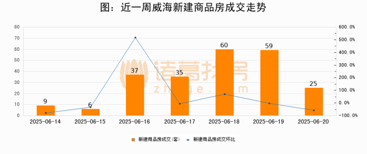 根据威海市住房和城乡建设局数据显示,2025年06月20日威海新建商品房成交25套,较昨日减少34套,环比下降57.6%