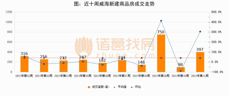 进入2024年第41周(10月07日-10月13日),威海新建商品房成交397套,较上周增加299套,环比上涨305.1%