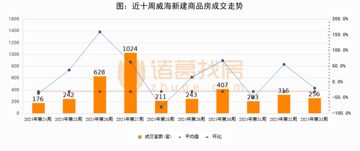 进入2024年第33周(08月12日-08月18日),威海新建商品房成交256套,较上周减少60套,环比下降19%