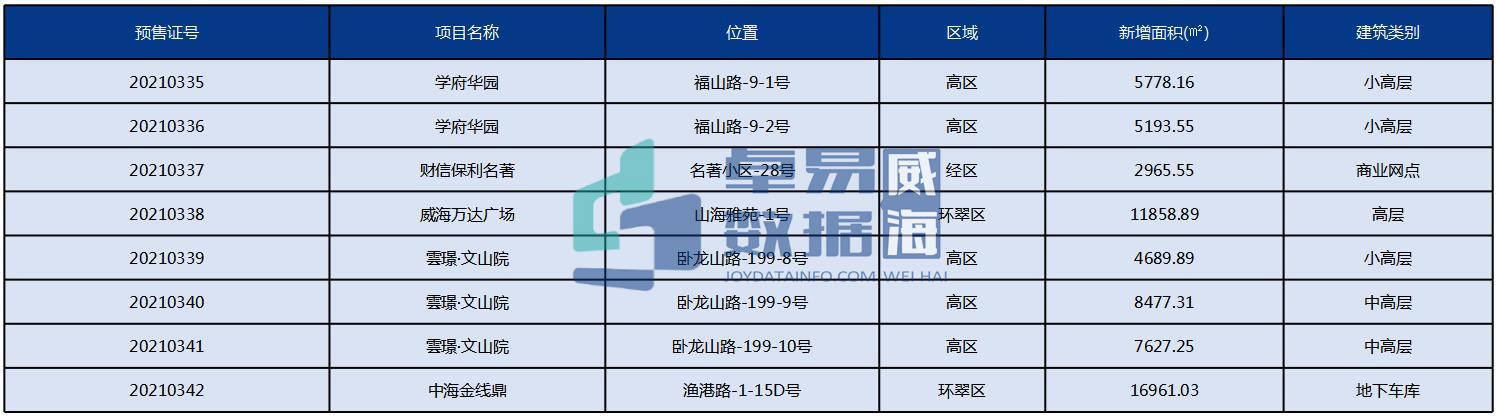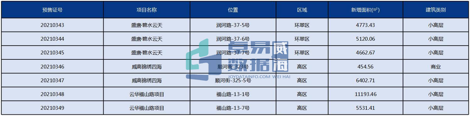 据卓易监测数据显示,12月威海市住房和城乡建设局更新了15张预售证,涉及学府华园、财信保利名著、威海万达广场、雲璟·文山院、中海金线鼎、盛唐·碧水云天、威高锦绣四海、云华福山路项目等8个项目。