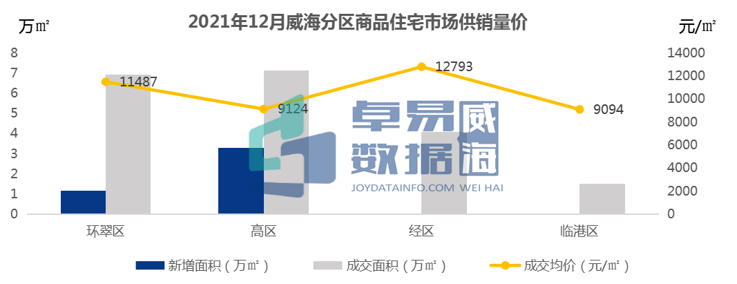 据卓易监测数据显示,12月威海商品住宅市场供应面积4.49万㎡,成交1775套,销售面积19.65万㎡,环比上涨75.9%,同比上涨538%;成交均价10717元/㎡,环比下降11.8%,同比下降11%。12月仅环翠区和高区有新增供应,高区成交最多,占全市36%。