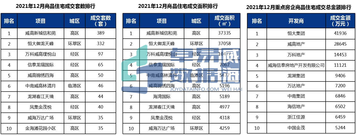 2021年12月,商品住宅成交套数top10高区占4席、经区占3席、环翠区占两席,临港区仅一个项目上榜;高区威高新城信和苑项目成交套数和成交面积均为较高;环翠区恒大御龙天峰项目本月在成交套数和成交面积排行榜上均位于第二,使得恒大地产占据本月房企成交排行榜首。