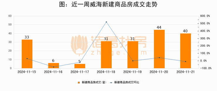 根据威海市住房和城乡建设局数据显示,2024年11月21日威海新建商品房成交40套,较昨日减少4套,环比下降9.1%