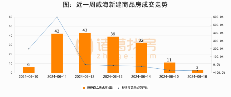 根据威海市住房和城乡建设局数据显示,2024年06月16日威海新建商品房成交3套,较昨日减少8套,环比下降72.7%