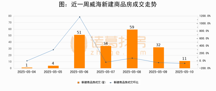 根据威海市住房和城乡建设局数据显示,2025年05月10日威海新建商品房成交11套,较昨日减少21套,环比下降65.6%