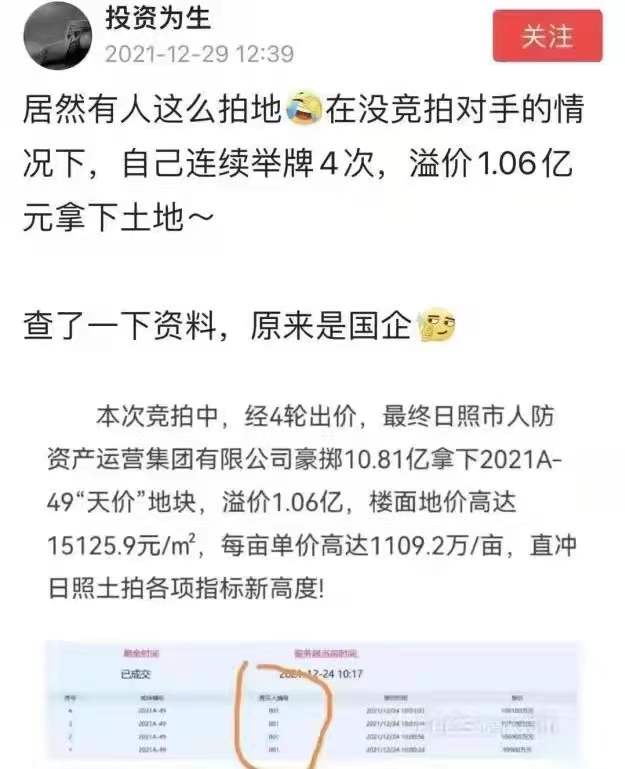 近日,山东省日照市的一宗住宅地块的竞买过程引发质疑。一张写有“居然有人这么拍地,在没竞争对手的情况下,自己连续举牌4次,溢价1.06亿元拿下土地。查了资料原来是国企”的截图在微信等社交平台传播。
