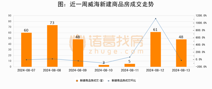 根据威海市住房和城乡建设局数据显示,2024年08月13日威海新建商品房成交48套,较昨日减少13套,环比下降21.3%。近一周威海新建商品房日均成交43套。08月13日单日成交48套,高于近一周平均水平11.6%。