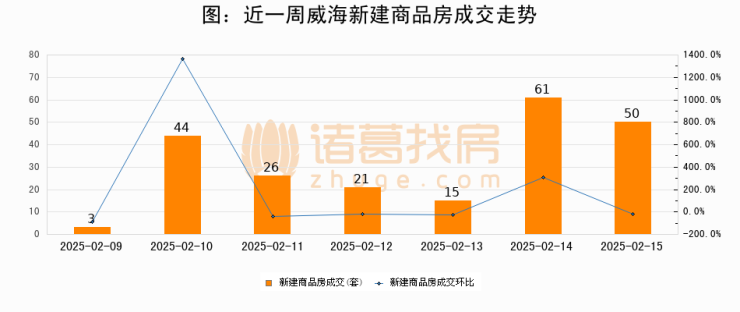 根据威海市住房和城乡建设局数据显示,2025年02月15日威海新建商品房成交50套,较昨日减少11套,环比下降18%